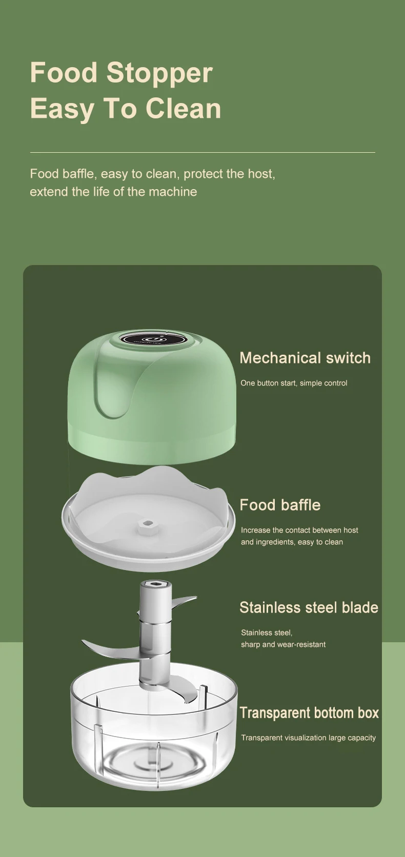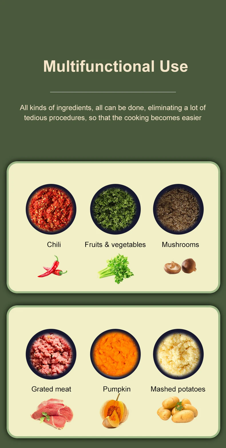4. Einfache Reinigung: Legen Sie einfach Lebensmittel oder Zutaten von Hand in die Mini-Küchenmaschine, schließen Sie den Deckel und beginnen Sie mit einem Knopf, um Lebensmittel schnell zu hacken. Die Schüssel und die Klinge können für eine einfache Reinigung getrennt werden.
